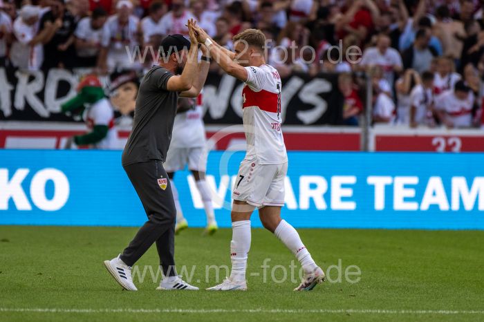 Jubel und Freude nach dem 5:0 bei Trainer Sebastian Hoeneß und Maximilian Mittelstädt (VfB Stuttgart).