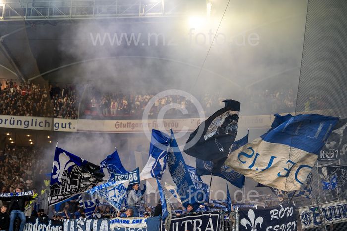 Bengalos, Pyrotechnik, Rauch steigt auf im Darmstädter Fanblock.