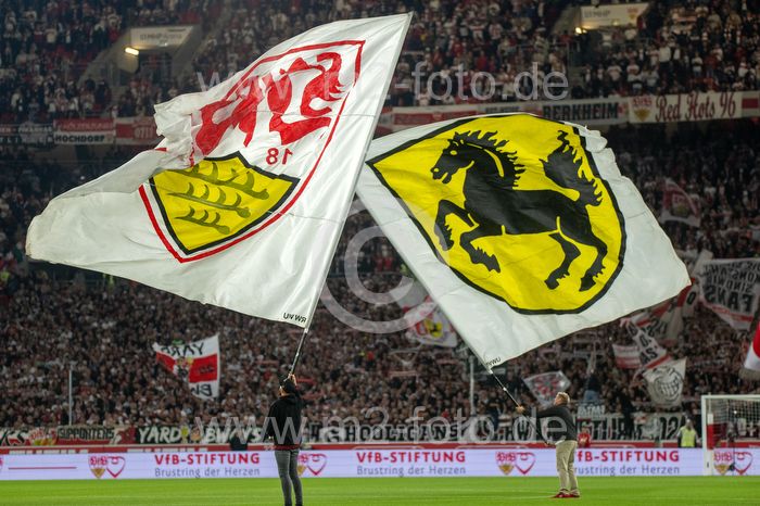 Feature, Symbolbild, Fahnen mit den Wappen des VfB Stuttgart und das Stuttgarter Rösle.