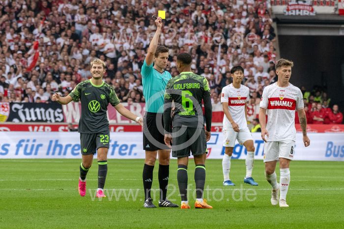 Schiedsrichter Daniel Siebert zeigt Aster Vranckx Silva (VfL Wolfsburg) die gelbe Karte.