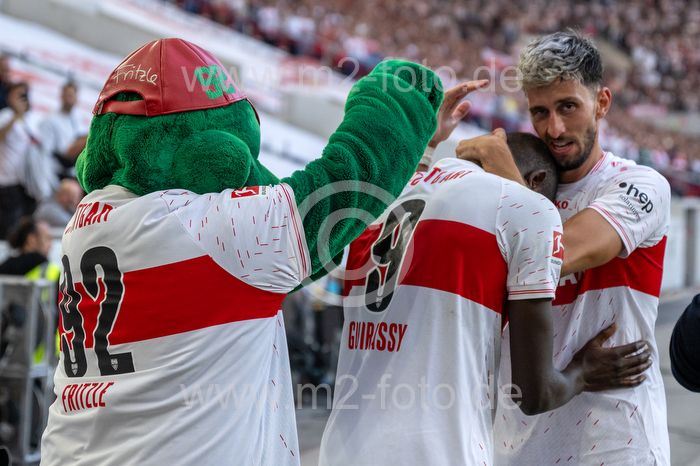 Torjubel des Torschützen Serhou Guirassy (VfB Stuttgart), Jubel und Freude bei Maskottchen Fritzle und Atakan Karazor (VfB Stuttgart).