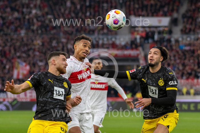 Salih Özcan (Borussia Dortmund), Jamie Leweling (VfB Stuttgart) und Ramy Bensebaini (Borussia Dortmund).
