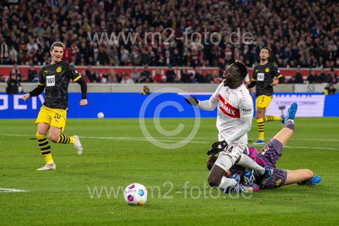 Torwart Gregor Kobel (Borussia Dortmund) foult Silas Katompa Mvumpa (VfB Stuttgart).