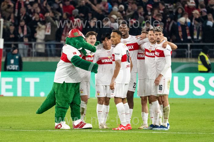 Schlussjubel und Freude bei Maskottchen Fritzle, Angelo Stiller, Wooyeong Jeong, Enzo Millot, Dan-Axel Zagadou, Waldemar Anton und Atakan Karazor (VfB Stuttgart).
