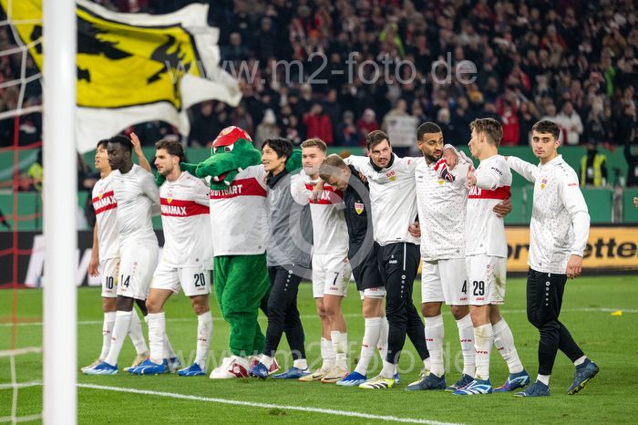 Jubel und Freude bei Wooyeong Jeong, Silas Katompa Mvumpa, Leonidas Stergiou, Maskottchen Fritzle, Genki Haraguchi, Maximilian Mittelstädt, Chris Führich, Pascal Stenzel, Josha Vagnoman und Anthony Rouault (VfB Stuttgart).
