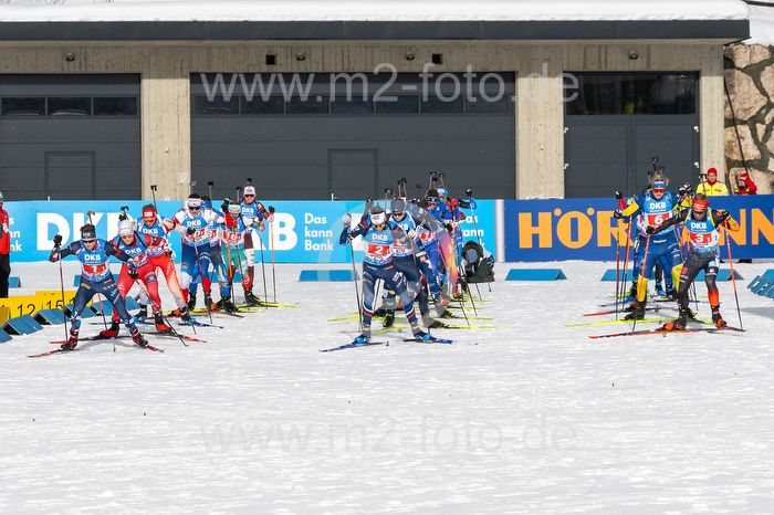 Der Startschuss ist gefallen, die 20 Staffeln gehen ins Rennen, v.l. Sturla Holm Laegreid (NOR), Eric Perrot (FRA) und David Zobel (GER).