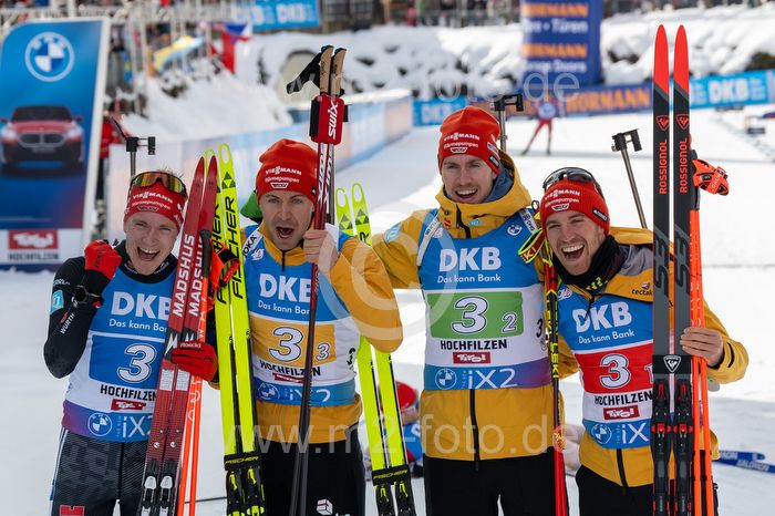 Jubel und Freude bei der deutschen Staffel über den 3. Platz, v.l. Benedikt Doll (GER), Philipp Nawrath (GER), Johannes Kuehn (GER) und David Zobel (GER).