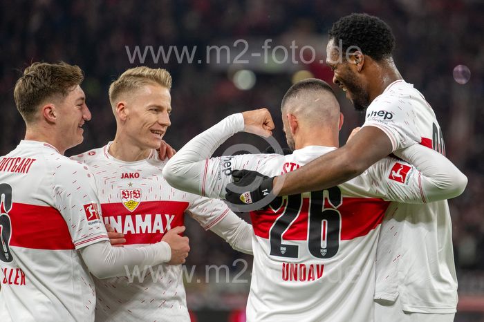Stuttgarter Torjubel, v.l. Angelo Stiller, Chris Führich, Torschütze Deniz Undav und Dan-Axel Zagadou (VfB Stuttgart).