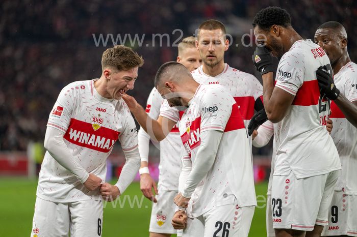 Angelo Stiller und der Torschütze Deniz Undav (VfB Stuttgart) lassen die Muckis spielen.