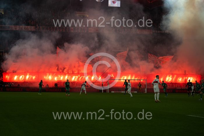 Bengalos, Pyrotechnik, Rauch steigt auf im VfB Fanblock, die etwas andere Pyroshow, Weichnachtsgrüße an alle VfBler.