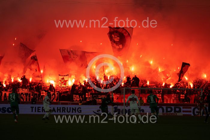 Bengalos, Pyrotechnik, Rauch steigt auf im VfB Fanblock.