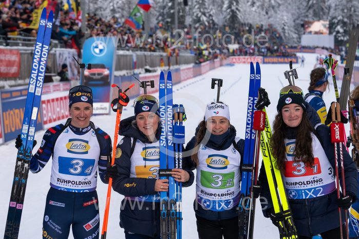 Jubel und Freude bei der Siegerstaffel v.l. Julia Simon (FRA), Sophie Chauveau (FRA), Jeanne Richard (FRA) und Lou Jeanmonnot (FRA).