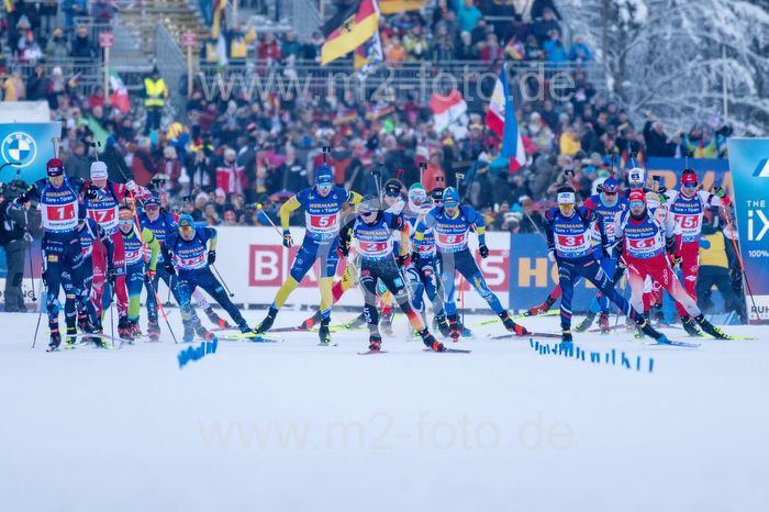 Der Startschuss ist gefallen, die 23 Staffeln gehen ins Rennen, v.l. Sturla Holm Laegreid (NOR), Dominic Unterweger (AUT), Miha Dovzan (SLO), Alexandr Mukhin (KAZ), Emil Nykvist (SWE), Justus Strelow (GER), Artem Pryma (UKR), Eric Perrot (FRA), Joscha Burkhalter (SUI) und Konrad Badacz (POL).