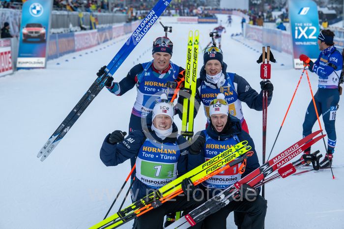 Jubel und Freude bei der Siegerstaffel v.l. Johannes Dale-Skjevdal (NOR), Vetle Sjaastad Christiansen (NOR), Tarjei Boe (NOR) und Sturla Holm Laegreid (NOR).