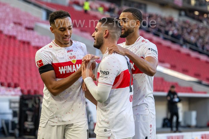 Torjubel des Torschützen Deniz Undav (VfB Stuttgart), Jubel und Freude bei Jamie Leweling und Josha Vagnoman (VfB Stuttgart).