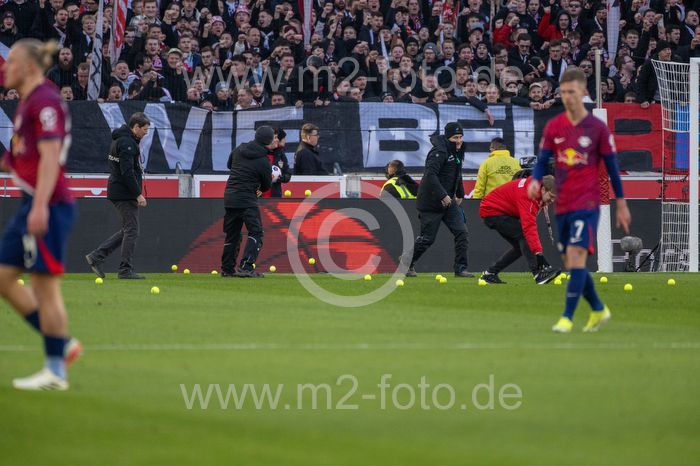 Das Spiel muss kurz unterbrochen werden, die VfB-Fans haben Tennisbälle auf das Spielfeld geworfen.