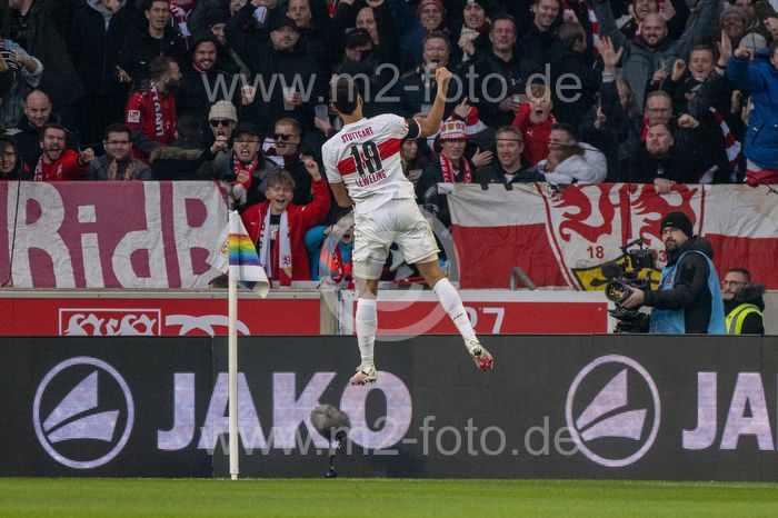 Torjubel des Torschützen Jamie Leweling (VfB Stuttgart).