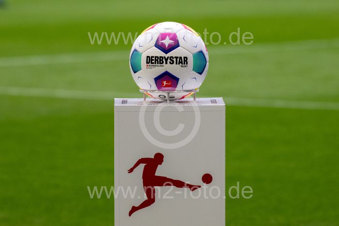 Feature, Symbolbild, der offizielle Spielball der DFL.DerbyStar select auf einem Podest mit dem Bundesligalogo.