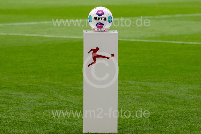 Feature, Symbolbild, der offizielle Spielball der DFL.DerbyStar select auf einem Podest mit dem Bundesligalogo.