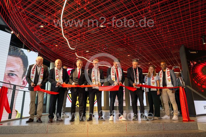 Eröffnung der neuen Haupttribüne v.l. Martin Rau, Markus Schmidt (Geschäftsführer der Stadion NeckarPark GmbH & Co.KG), Oberbürgermeister der Landeshauptstadt Stuttgart Dr. Frank Nopper, Vorstandsvorsitzender Alexander Wehrle (VfB Stuttgart), Praesident Claus Vogt (VfB Stuttgart), Lutz Meschke (Porsche AG), Bettina Fetzer (Mercedes Banz AG) und Cacau.