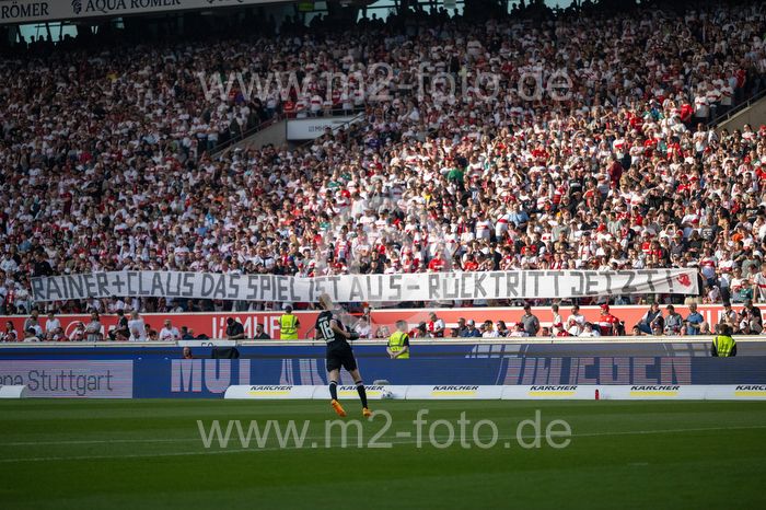Transparent, Spruchband von den Fans im VfB Fanblock mit dem Text: Rainer + Claus das Spiel ist aus - Rücktritt jetzt!.