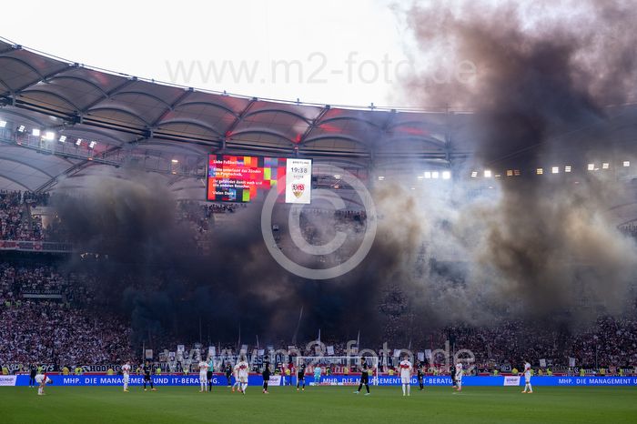 Bengalos, pyrotechnics, Schwarzer Rauch steigt auf im VfB Fanblock.