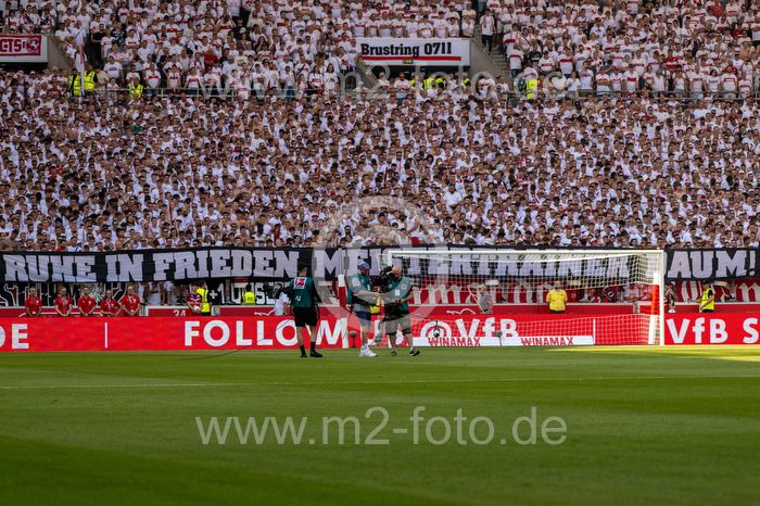 Transparent, Spruchband von den VfB Fans im Fanblock mit dem Text: Ruhe in Frieden Meistertrainer Daum!.