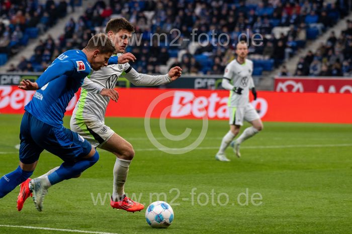 Adam Hlozek (TSG 1899 Hoffenheim) und Joakim Maehle (VfL Wolfsburg).