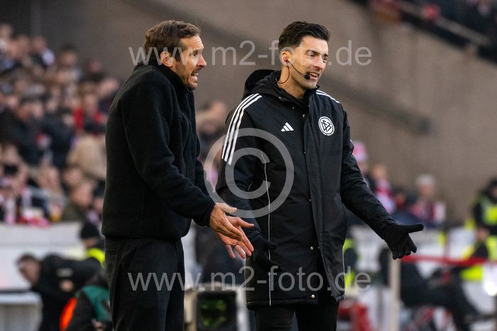 Trainer Julian Schuster (SC Freiburg) und Vierter Offizieller Florian Badstübner im Disput.
