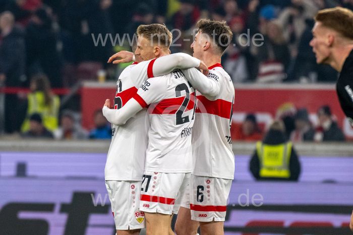 Torjubel des Torschützen Deniz Undav (VfB Stuttgart), Jubel und Freude bei Assisi Chris Führich und Angelo Stiller (VfB Stuttgart).
