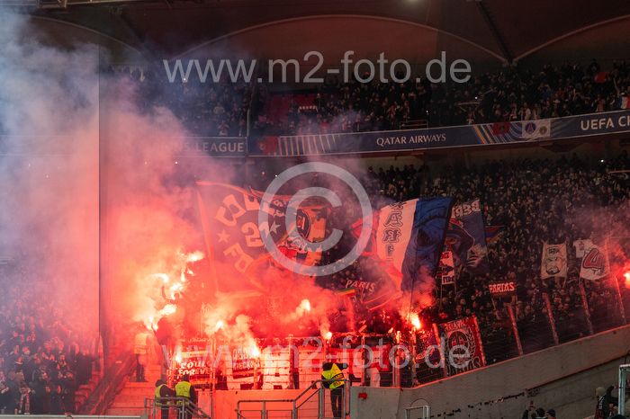 Bengalos, pyrotechnics, Rauch steigt auf im PSG Fanblock.