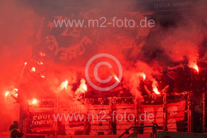 Bengalos, pyrotechnics, Rauch steigt auf im PSG Fanblock.