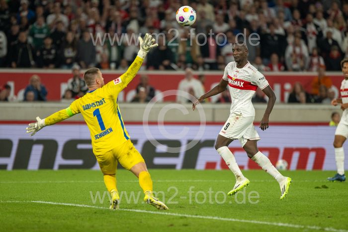 Serhou Guirassy (VfB Stuttgart) erzielt das 3:1, Torwart Marcel Schuhen (SV Darmstadt 98).