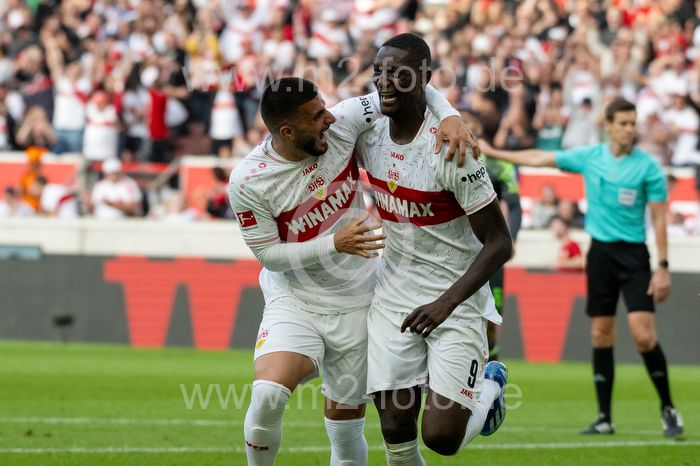 Torjubel des Torschützen Serhou Guirassy (VfB Stuttgart), Jubel und Freude bei Deniz Undav (VfB Stuttgart).