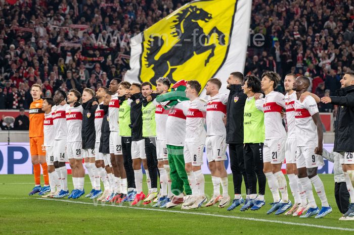 Torwart Alexander Nübel, Wooyeong Jeong, Silas Katompa Mvumpa, Leonidas Stergiou, Chris Führich, Deniz Undav, Enzo Millot, Dan-Axel Zagadou, Jamie Leweling, Pascal Stenzel, Atakan Karazor, Maskottchen Fritzle, Angelo Stiller, Maximilian Mittelstädt, Genki Haraguchi, Hiroki Ito, Waldemar Anton, Serhou Guirassy und Deniz Undav (VfB Stuttgart) feiern mit Ihren Fans.