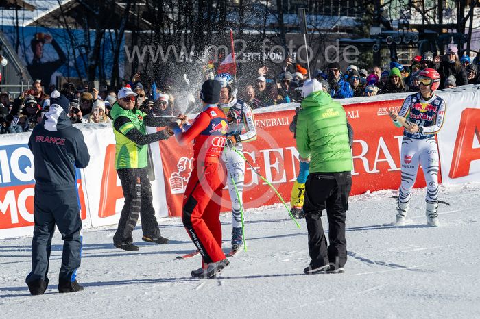 Thomas Dressen (GER) geniesst die Champagnerdusche von sein Team, Marco Odermatt (SUI) und Josef Ferstl (GER).