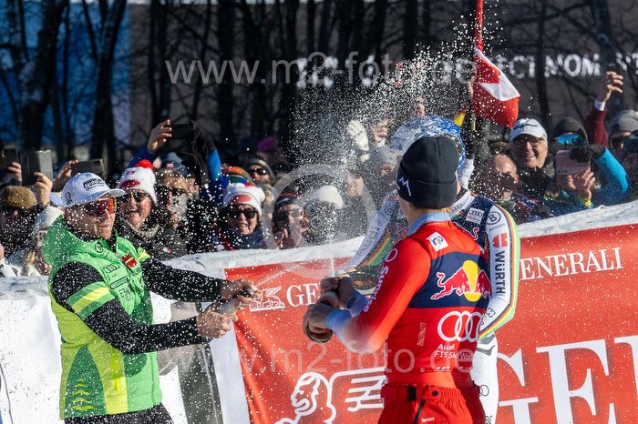 Thomas Dressen (GER) geniesst zum Abschied die Champagnerdusche von sein Team und Marco Odermatt (SUI).