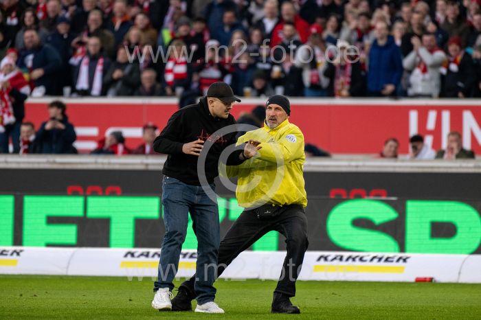 Ein Fan wird vom Spielfeld abgeführt.