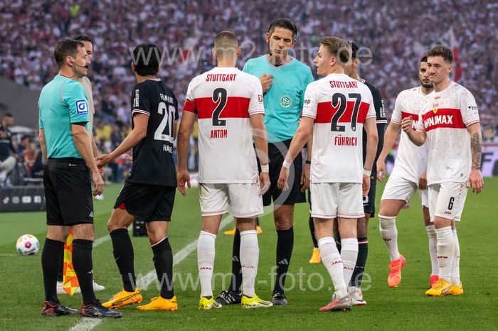 Schiedsrichter-Assistent Christian Dietz, Trainer Dino Toppmöller (Eintracht Frankfurt), Makoto Hasebe (Eintracht Frankfurt), Waldemar Anton (VfB Stuttgart), Schiedsrichter Deniz Aytekin, Chris Führich (VfB Stuttgart) und Angelo Stiller (VfB Stuttgart).