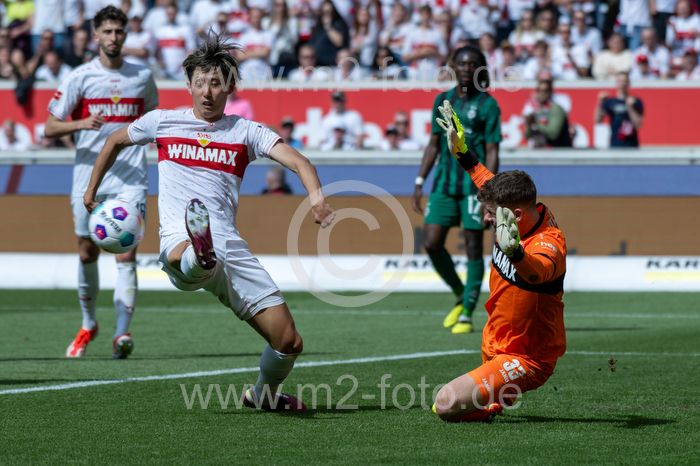 Hiroki Ito und Torwart Alexander Nübel (VfB Stuttgart).