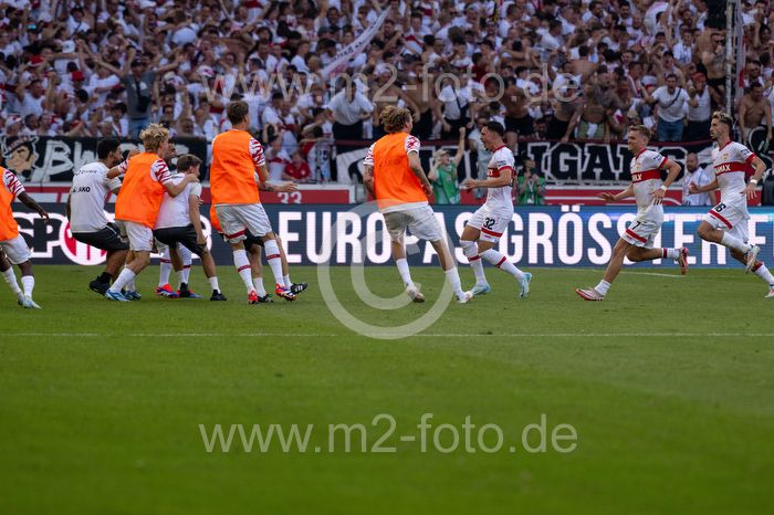 Stuttgarter Torjubel, mittendrin der Torschütze #32 Fabian Rieder (VfB Stuttgart).