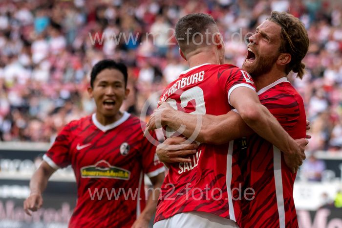 Torjubel des Torschützen Lucas Höler (SC Freiburg), Jubel und Freude bei Roland Sallai (SC Freiburg).