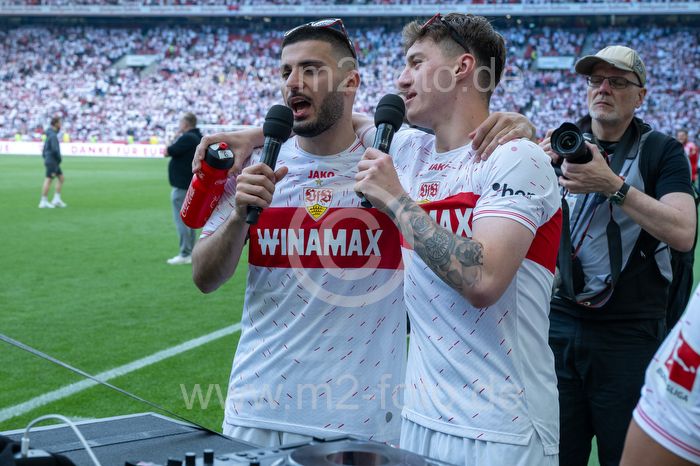 Deniz Undav und Angelo Stiller (VfB Stuttgart) stimmen den Song von Howard Carpendale Ti Amo an.
