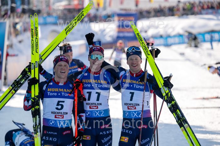 Norwegischer dreifach Erfolg, 2.Platz Johannes Dale-Skjevdal, 1.Platz Johannes Thingnes Boe und 3.Platz Tarjei Boe (NOR).