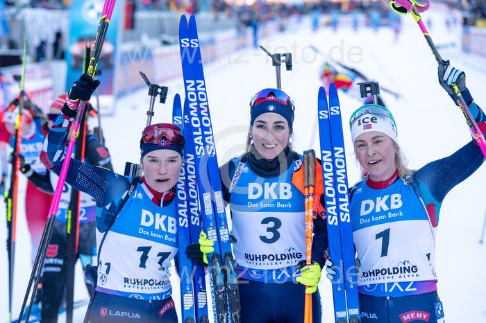 Jubel und Freude bei Juni Arnekleiv (NOR), Lisa Vittozzi (ITA) und Ingrid Landmark Tandrevold (NOR).
