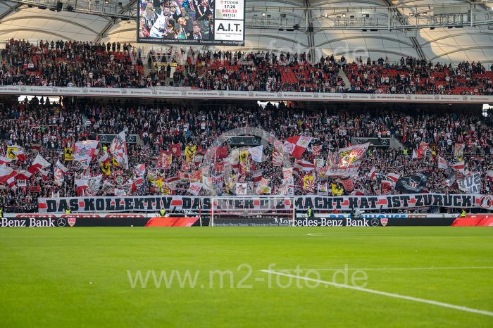 Transparent, Spruchband von den VfB-Fans im Fanblock mit dem Text: "Das Kollektiv das hier die Macht hat ist zurück".