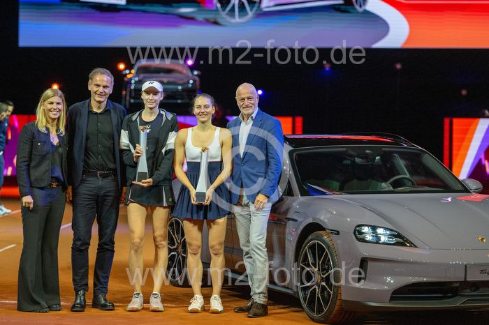 Sportliche Leiterin Anke Huber, Oliver Blume (Vorstandsvorsitzender der Dr. Ing. h. c. F. Porsche AG und der Volkswagen AG) und die Siegerin Elena Rybakina (KAZ), Marta Kostyuk (UKR) und Turnierdirektor Markus Guenthardt.