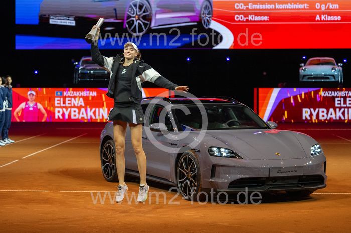 Jubel und Freude bei der Siegerin des Porsche Tennis Grand Prix 2024 Elena Rybakina (KAZ).