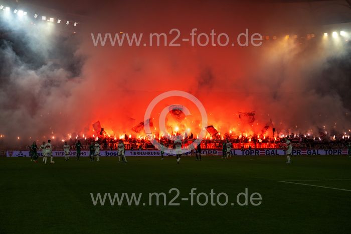 Bengalos, Pyrotechnik, Rauch steigt auf im VfB Fanblock.