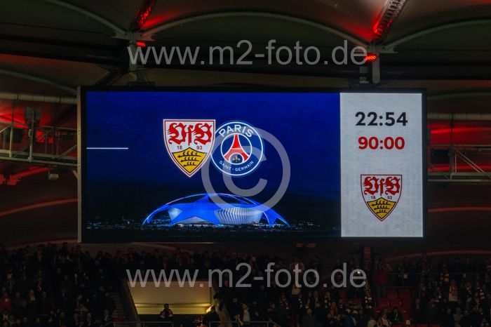 Feature, Symbolbild, die Vereinswappen vom VfB Stuttgart und Paris St. Germain werden auf der Anzeigetafel angezeigt.
